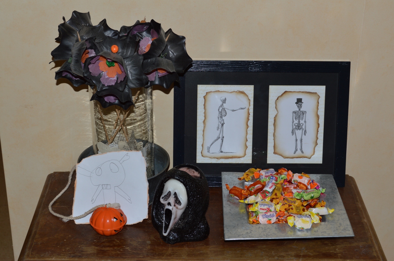 ICI. Une tête de mort dessinée par ma petite dernière, des bonbons... juste de quoi effrayer nos visiteurs.