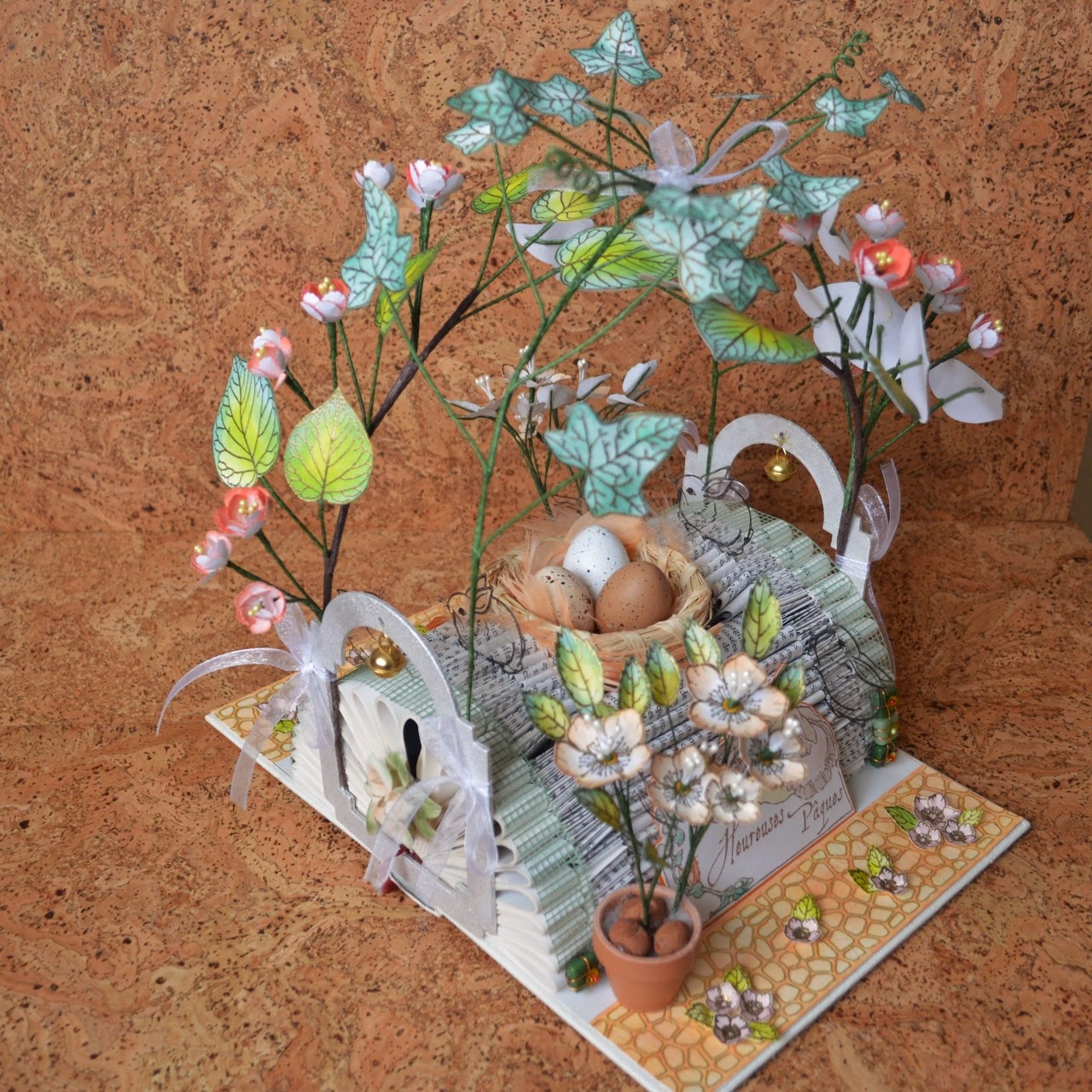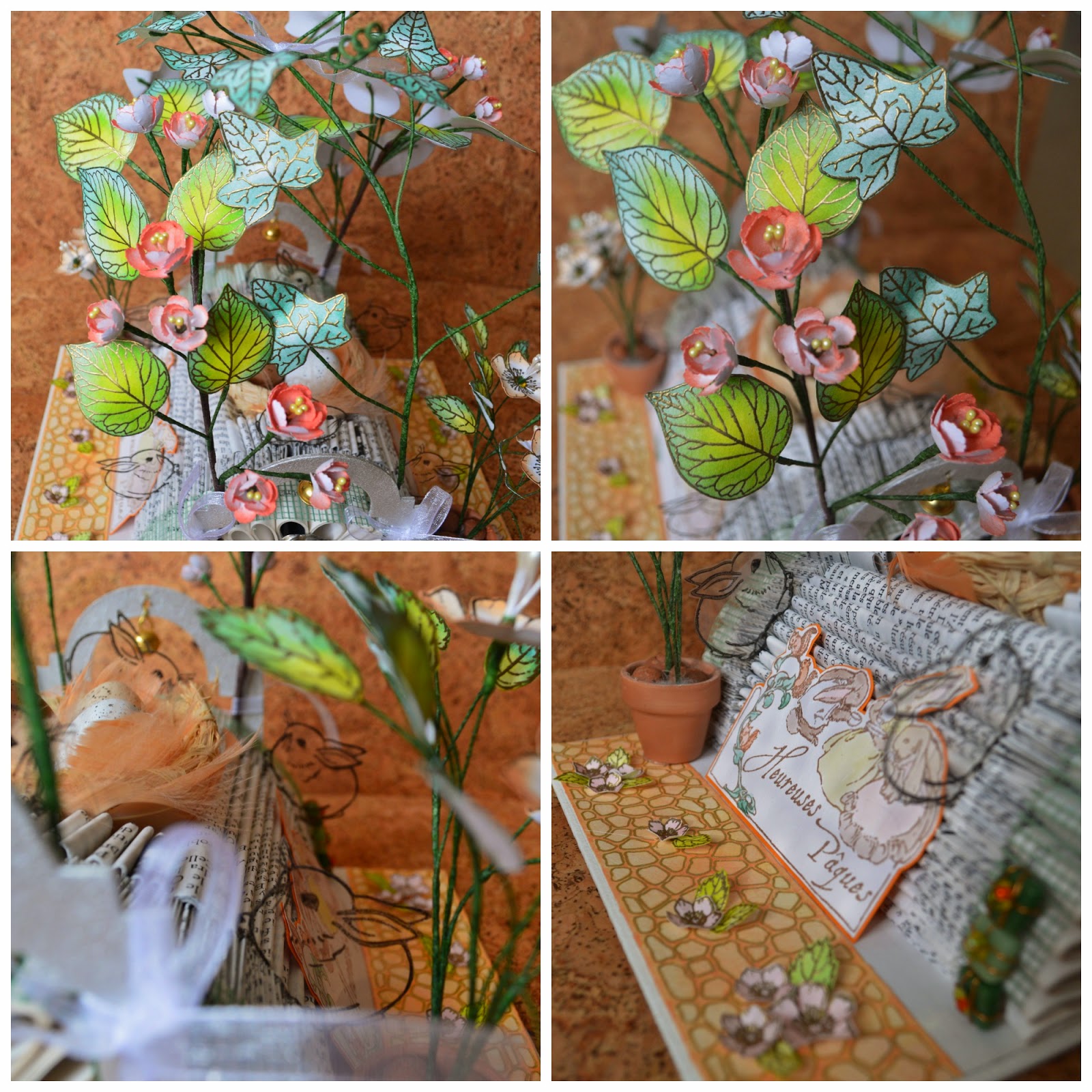 Je vous montre la déco de table que j'ai réalisé pour fêter Pâques. De nouveau un livre altéré, avec des branchages, des fleurs et ... A vous de voir! C'est tout en volume :-)